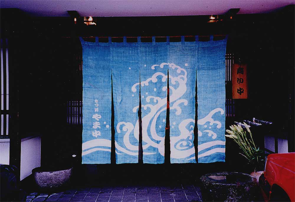 福岡の有名店【もつ鍋やま中】様2号店の麻暖簾です。もう20年来、ずーっとお世話になってますm(__)m いつも頂いたアイデアを素に図柄、色などは「お任せ」で、店舗毎ののれんや、四季暖簾を製作させて頂いてます。 こちらは、夏向けという事で、波柄を下絵からおこし、麻生地を使い当店の伝統技法「筒描き手染め」で製作しました。 |